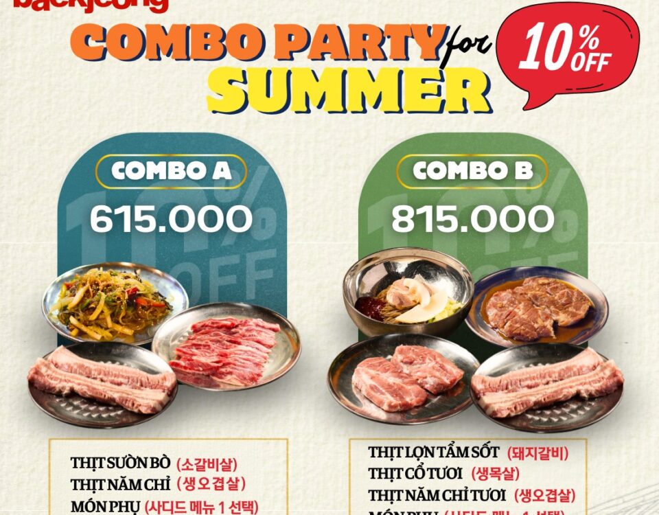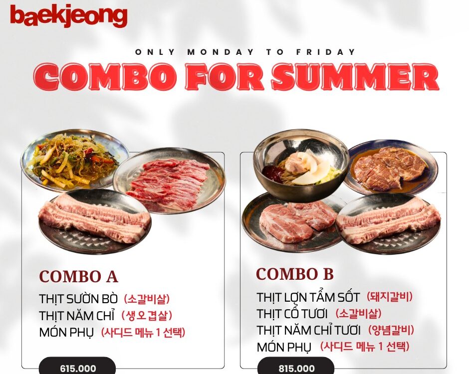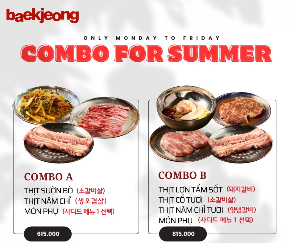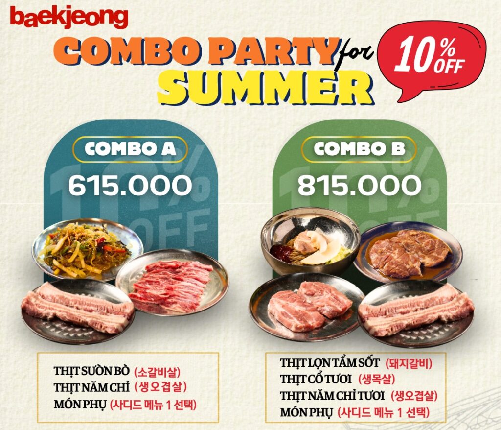 KHỞI ĐỘNG TUẦN MỚI – 4 COMBO ƯU ĐÃI 10% CHÀO HÈ! Mùa hè này, Baek Jeong mang đến cho bạn 4 combo thịt nướng chuẩn